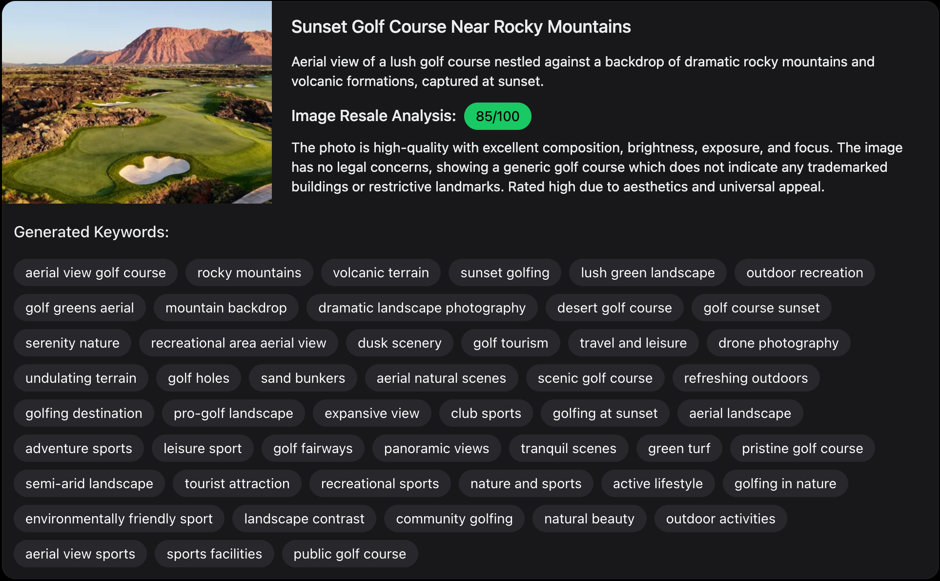 Generate high-performing descriptions and keywords to a .CSV file, ready for upload to major stock photo sites.